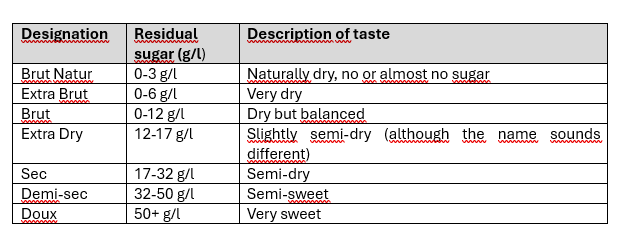 Let's finish with a little educational interlude. How can you tell the difference between brut and demi-sec? The label on a sparkling wine bottle will tell you how much residual sugar the wine contains – in other words, how sweet it will taste. There are seven levels on the wine sweetness scale. For clarity, we have put them into a simple table: